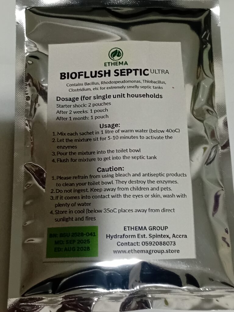 Bioflush Septic is an enzyme-based septic tank treatment powder that is used in all toilets (manholes, biodigester, kvip, pitlatrine or potty) to: